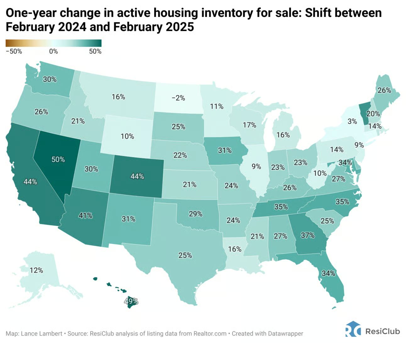 Realtor.com (July 2025 report): Inventory rose 24.8% year-over-year, unsold homes up 16.9%, homes remain on market longer (median 58 days)—favoring buyers. (Realtor.com)